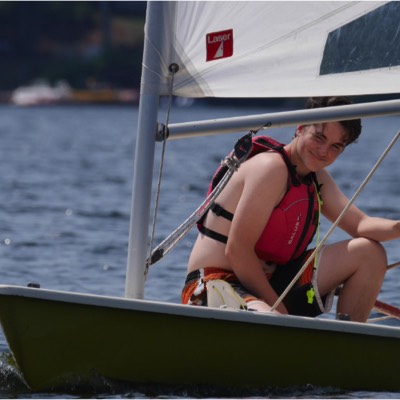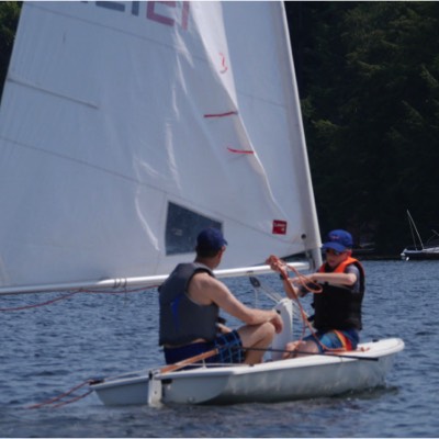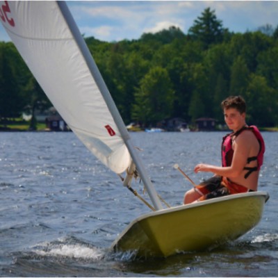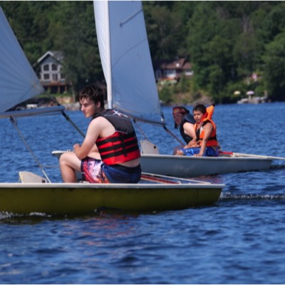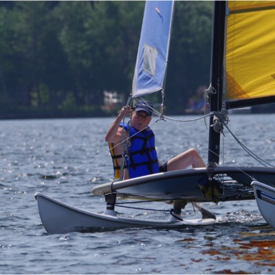 The sailboat was built in 1933-34 by Paul Saarimaki's dad, and was all hand made, the boat, the mast and boom and the sail. Paul's father was a tailor so he had access to sone heavy duty sewing machines to make the sail. He called it the Fanny Dunker and it was used a lot to take guests out sailing from Rest Point Lodge. The closest up picture shows Roger's mother, Evelyn Saarimaki sailing it but you can see the hand hewn boom and the hand made sail in the photo. The other picture shows is out on the lake. Both pictures likely from the early 1940's. It has been said that it was the first sail craft on the lake that anyone could remember. Submitted by Roger Saarimaki.